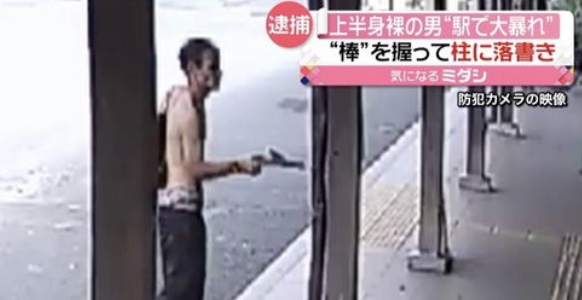 先月、福岡・篠栗町の駅にある防犯カメラの映像には、上半身裸の男が手に持った棒のようなもので、駅の柱やパイプを何度もたたきつける様子が映っていました。さらに、駅の前に設置されていたパイロンを、すべて蹴り倒す様子も捉えられていました。