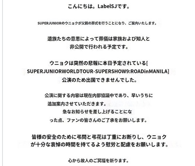 ウニョクは突然の悲報に本日予定されている[SUPERJUNIORWORLDTOUR-SUPERSHOW9:ROADinMANILA]公演のため出国できませんでした。