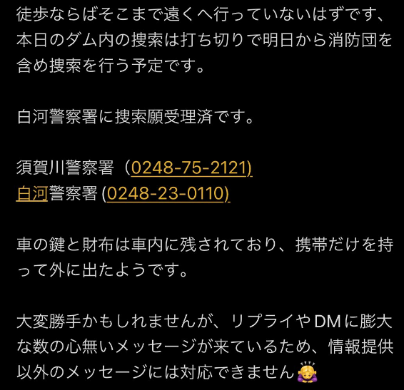 【失踪】コレコレchで行方不明者案件 相談者manamiさんの旦那が消息不明に会社も無断欠勤し 福島県 大滝川砂防ダムに放置車両 発見 目撃情報求む