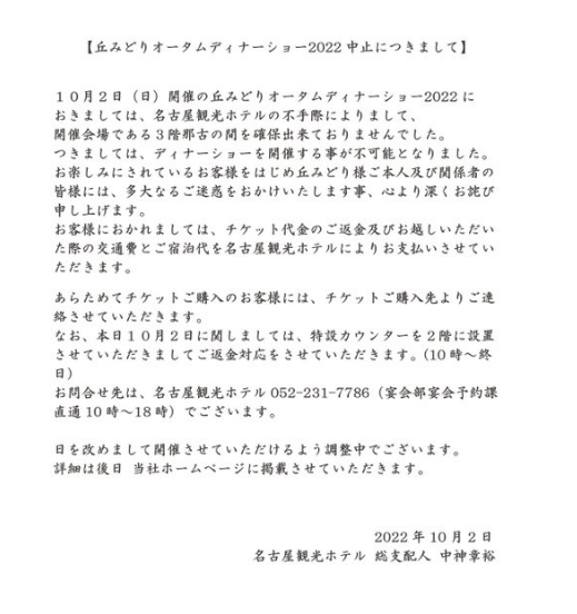 名古屋観光ホテルより謝罪文