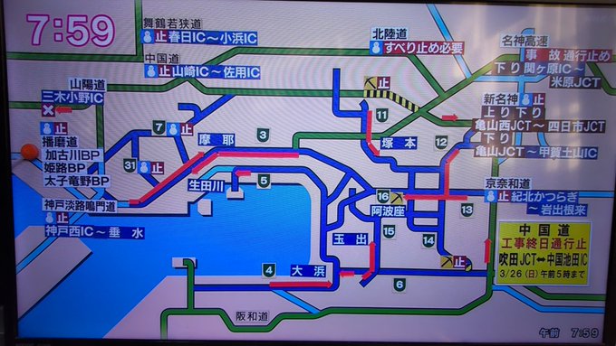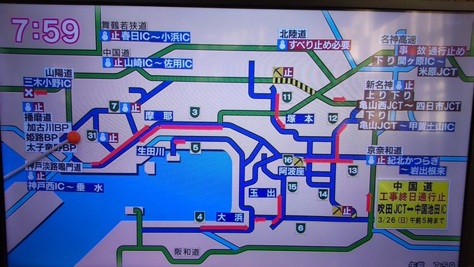 1月26日、阪神高速の7号北神戸線と31号神戸山手線や加古川バイパス·姫路バイパス·太子竜野バイパスの全線でも雪や路面凍結の影響で通行止めが発生した、通行止めは現在解除された模様だが、渋滞が発生しているエリアもありますので通行の際はお気をつけ下さい。