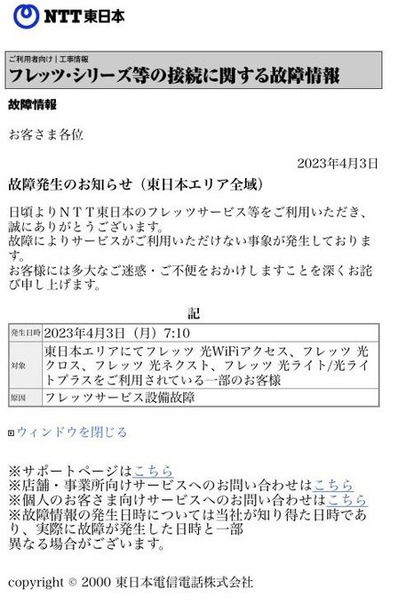 4月3日、NTT東日本・フレッツ光に障害発生、ドコモ光とスマホ回線が繋がらないと情報相次いでいます。