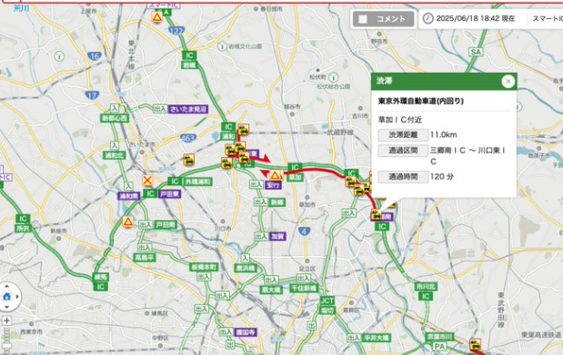 外環道 事故 / 草加IC 事故 / 川口東IC 渋滞 / 外環道 渋滞速報 / 東京外かく環状道路 / 2025年6月18日 交通情報 / 三郷中央 車線規制 / 草加市 高速事故 / JARTIC情報 / ドライブ注意