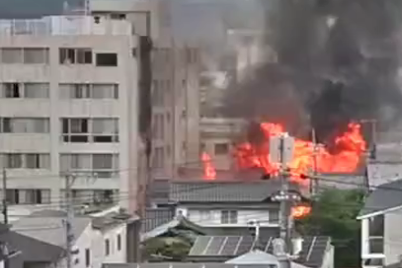 写真からもわかるように、大規模な炎と黒煙が上空へ立ち昇り、周囲の建物にも延焼の危険がある状態です。