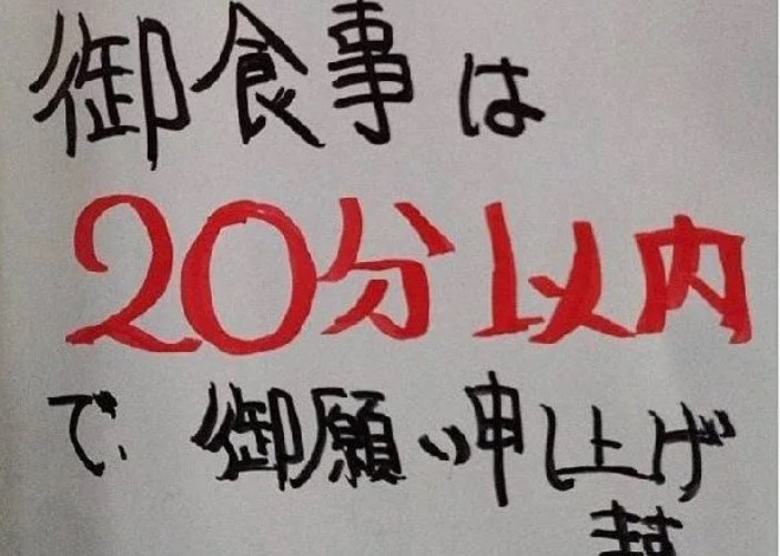 この投稿には、**券売機の上に貼られた「お食事は20分以内でお願い申し上げます」**という注意書きの画像も添えられていました。