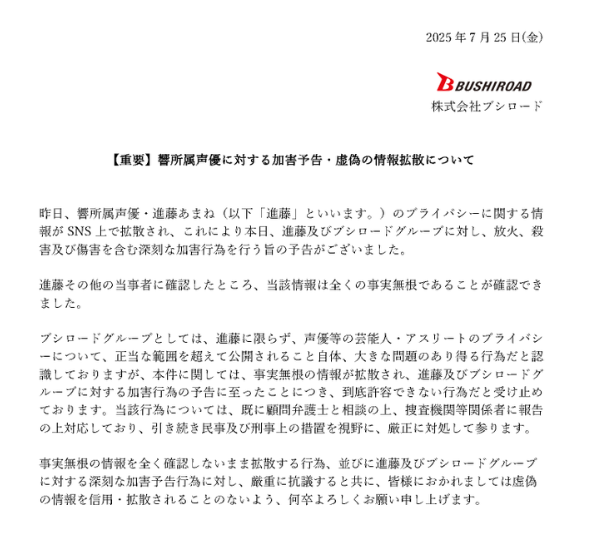 2025年7月25日、株式会社ブシロードは公式サイトにて、所属声優・進藤あまねさんに対する加害予告および虚偽情報の拡散に関する重大な声明を発表しました。