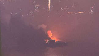 🚒【消火活動続行中】2隻が燃焼、夜の海に立ちこめる煙