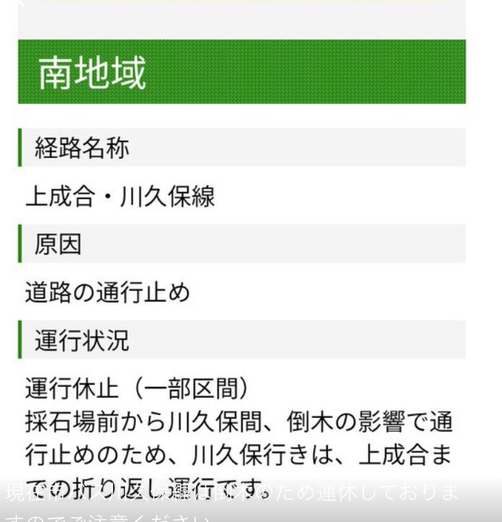 「現在、市バス川久保線は倒木のため運休しておりますのでご注意ください。」
