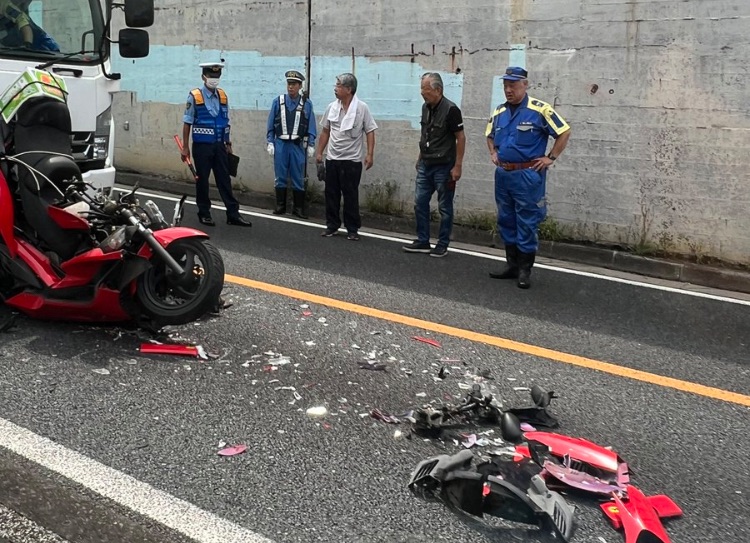 バイクがトラックに挟まれた人身事故