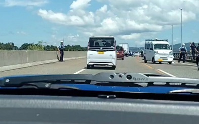 現場では警察による事故処理と片側交互通行規制が行われており、上下線ともに渋滞が発生しています。
