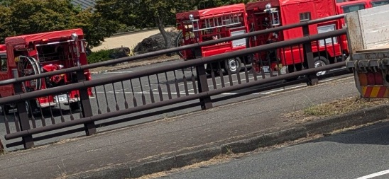 目撃者によると、複数台の赤い小型消防車が出動し、現場付近にはガードレールや歩道がある道路脇に緊急車両が並んでいます。遠景には木々や岩山が見え、消防隊が消火活動を行っている様子が確認されています。