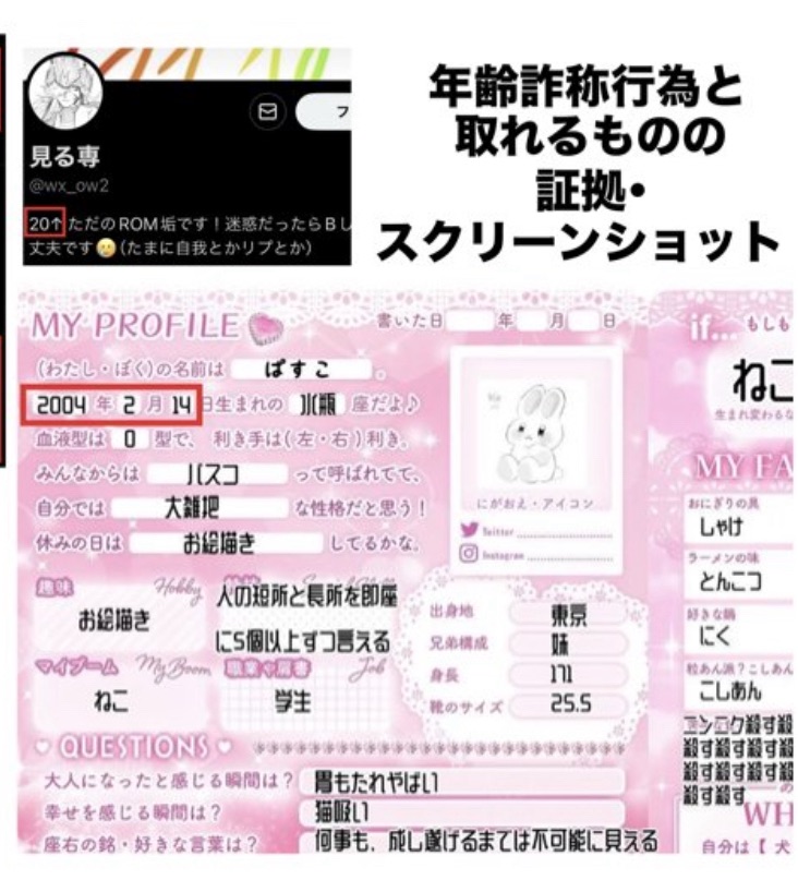 SNSプロフィールや配布物にて「2004年生まれ」と公言しながら、実際には未成年時に成人済みと偽って活動。 大学生を名乗りつつ、当時は**中学3年生(2023年時点)**だったことが判明。 過去のスクリーンショットや自己紹介カードが証拠として拡散。