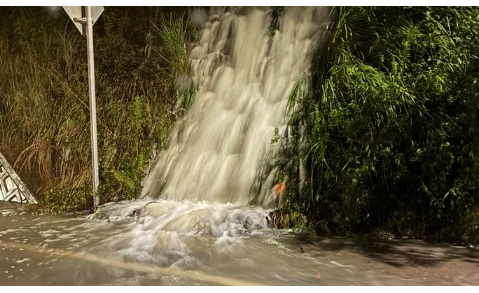 投稿された現場写真からも分かる通り、道路に向かって大量の水が流れ落ち、車両通行が困難な状態となっています。