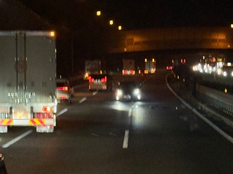夜間走行のため視界が悪く、急な車線変更や急停車に十分注意が必要です。