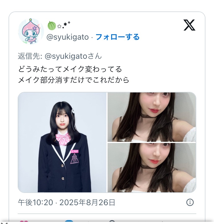 「どうみたってメイク変わってる メイク部分消すだけでこれだから」