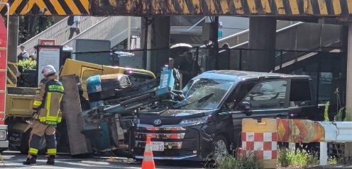 発生日時:2025年8月27日 午前8時20分頃 発生場所:神奈川県横浜市神奈川区西神奈川1丁目、JR東神奈川駅付近の高架下 状況: トラックが高さ制限バーに接触 荷台からショベルカーが落下 対向車(黒のミニバン)に直撃 消防車・警察が出動し現場は騒然