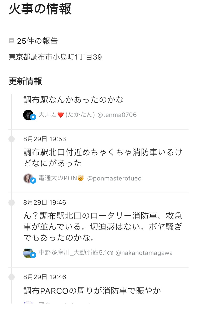 「調布駅北口付近めちゃくちゃ消防車いるけど、なにがあった?」 「PARCOの周りが消防車で埋まってる」 「駅前に救急車も来ていたけど、切迫感はなかった。ボヤ騒ぎ?」 「消防署の車がほぼ総出動レベルで駅前に集結してた」