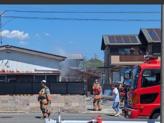 現場写真には、消防車や消防隊員が出動している様子が確認され、住宅街の一角から煙が上がっているのが見えます。近隣住民も避難や様子を見守る姿があり、緊迫した状況です。