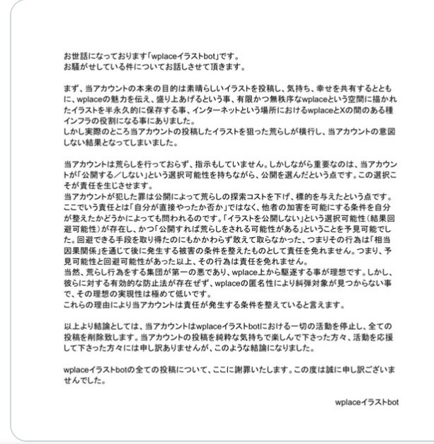 「活動を継続すれば同じ被害が拡大し、wplace全体の健全性を脅かす可能性があると判断しました。」