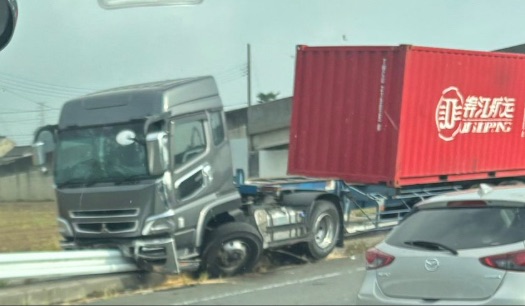 事故車両はコンテナを積載した大型トレーラーで、ガードレールに衝突して停車している様子が確認されています。幸いにも大規模な二次被害は報告されていませんが、今後も処理に時間がかかる可能性があります。
