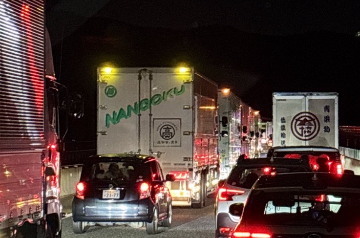 長時間の停滞により、物流トラックや帰宅途中の一般車両が数キロにわたり足止めとなっています。