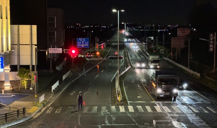 警備員による交通整理が行われ、赤色灯を手にした作業員が安全確保にあたっている様子が確認されています(写真参照)。
