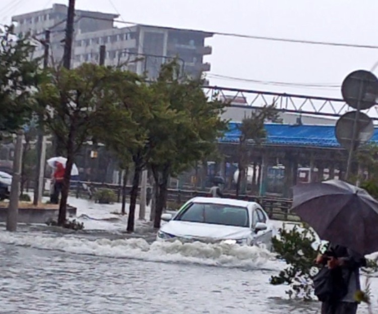 実際にSNSで共有された写真には、直江津駅周辺の道路が冠水し、車が水に浸かりながら走行している様子や、傘を差した人々が冠水した歩道を慎重に歩く姿が確認できます。
