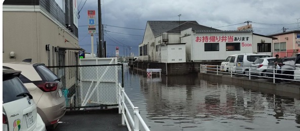 写真では、弁当店や住宅街の前の道路が完全に冠水しており、歩行者や車両の通行は極めて危険な状況となっています。