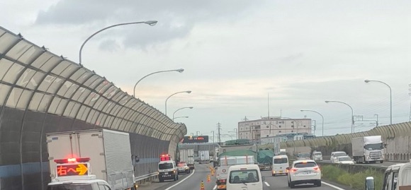 SNS上の目撃情報によると、事故車両は左車線および路肩に停車し、道路には破片が散乱しているとのこと。事故処理のため走行車線規制が行われ、渋滞が発生しています。