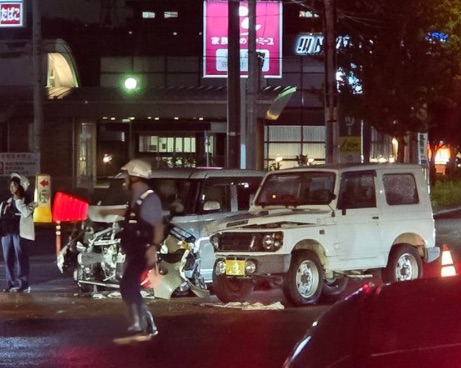 写真からは、白いSUV車が大破しており、前部が激しく損傷している様子が確認できます。警察が現場検証を行っているため、通行規制がかかっている模様です。