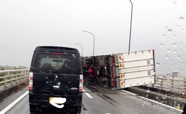 午後2時50分頃、強風と雨の中で大型トラックが横転し、隣を走行していた軽自動車1台がクラッシュしたと見られています。