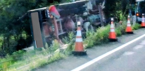 場所:新潟県阿賀町石間(国道49号線・川沿い) 状況:大型ダンプ横転 道路:塞がれていないが注意が必要 発生時間:9月8日16時30分頃