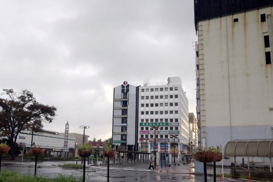 実際の写真には、沼津駅周辺と思われる市街地で、道路が濡れた状態で規制が行われている様子が映っています。