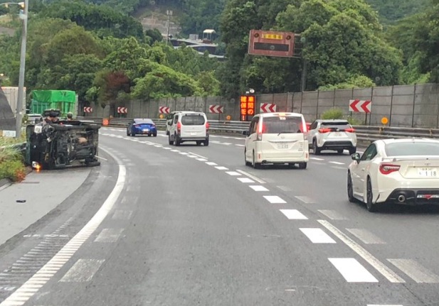 実際に撮影された現場写真では、黒色の車両が横転し、左側路肩に停車している様子が確認できます。周囲の車両は右側車線を慎重に走行しており、事故対応のために速度を落として通過している状況です。