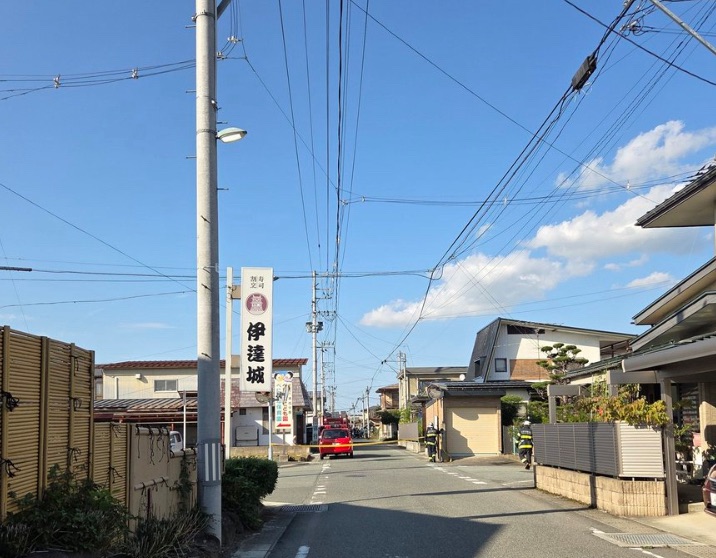 火災が確認されたのは、山形市伊達城2丁目7周辺の住宅街。比較的静かな住宅エリアで、付近には生活道路や一般住宅が多く並んでいます。現場には「伊達城」と書かれた看板が立ち、地元住民には馴染み深いエリアです。