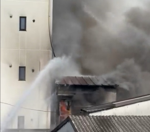 現場にはすでに多数の消防車両が出動し、放水による消火活動が続いています。投稿画像には、隣接する建物に延焼しないよう懸命に放水する様子が映し出されています。