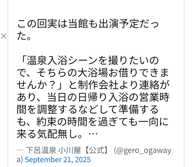 制作側から「入浴シーンの撮影のため大浴場を貸してほしい」と依頼。 小川屋旅館は営業時間調整・準備を行い撮影当日に備える。 当日、制作スタッフは現れず連絡もなし。 後日、「撮影はなくなった」「すでに下呂を離れた」と伝えられる。 旅館側がX(旧Twitter)で告発 → 一気に拡散、炎上。