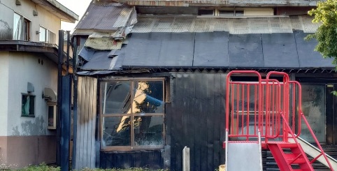 現地の写真では、黒く焼け焦げた外壁や窓ガラスの破損が確認できます。屋根の一部も損傷しており、火の勢いの激しさを物語っています。すぐそばには遊具が設置された公園があり、延焼の危険性も懸念されました。