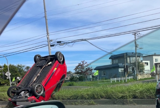 2025年9月23日午前、北海道北広島市輪厚(わっつ)中央5丁目付近の国道36号線・札幌方面にて、赤色の乗用車が横転する事故が発生しました。