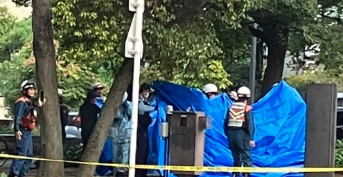 目撃者やSNS投稿によると、午後5時過ぎから平和大通り周辺に緊急車両が殺到。警察は「KEEP OUT」と書かれた黄色テープを四方に張り巡らし、さらに事件の中心と思われる場所をブルーシートで覆い隠したとの報告があります。