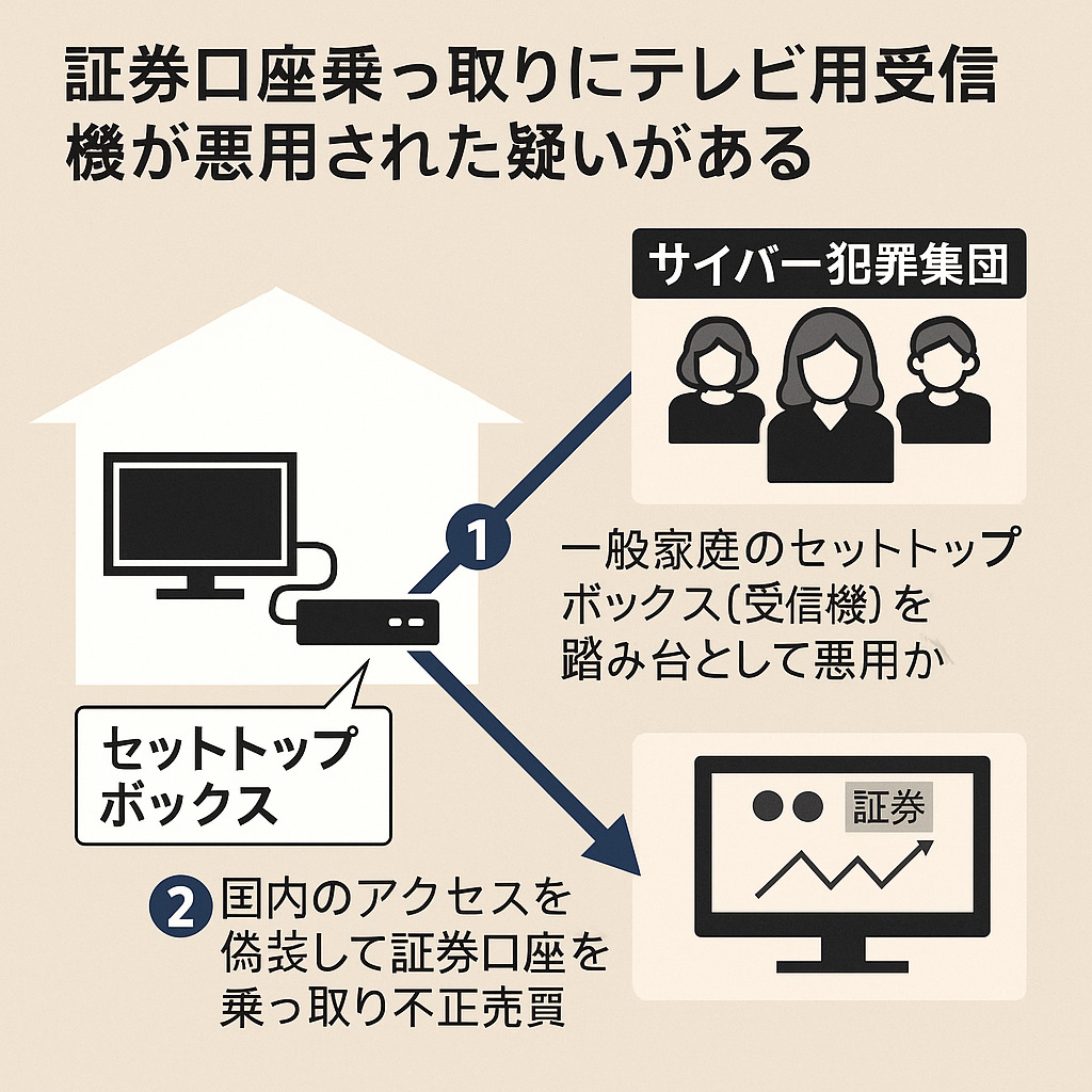 不正アクセスは国内の正規ユーザーを装う手口で行われました。 犯行グループは、家庭に設置された**STBを「踏み台」**として利用したとみられます。 2025年1月から8月までに確認された不正売買の被害総額は約6,770億円に上ります。 被害は株式の無断売却や購入によって発生。