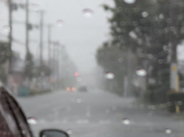 現地から投稿された写真には、フロントガラスに水滴が付いた車内から撮影された、雨と濁流に包まれた道路の様子が写っています。視界が悪化しており、道路中央まで水が溜まっている様子が確認できます。