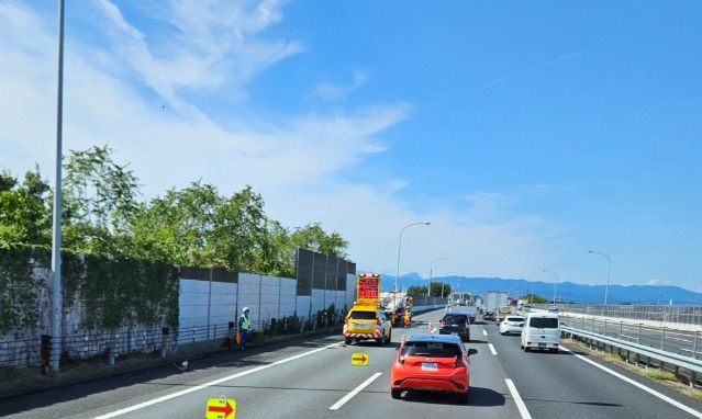 青空の下で視界は良好だったものの、車両の停止により追い越し車線も流れが鈍化した様子が写真から確認できます。