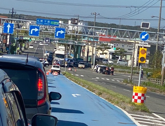 片側車線がふさがれたことで、札幌・千歳方面へ右折する車両が信号を数回待たなければ進めない状況が報告されています。