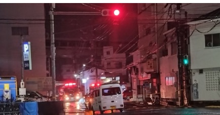 投稿された写真では、赤信号の交差点付近に消防車や警察車両が停車し、道路が濡れて反射する光景が確認できます。深夜のため周囲は暗く、緊迫した状況が伝わってきます。