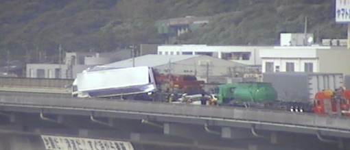 現場写真では、大型トラックが斜めに停車し車線を塞いでいる様子が確認できます。