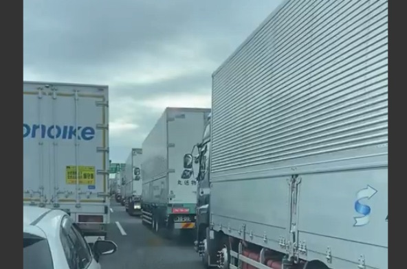 投稿された写真には、複数の大型トラックが車線を埋め、車がほとんど動かない状態の様子が映っています。現場上空は曇天で、視界もやや悪く、運転には十分な注意が必要です。