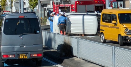 現場は「ヨシケイ多米店」付近の交差点で、軽自動車が横転しており、消防車や警察が出動。飯村方面への道路は現在も通行止めとなっています。