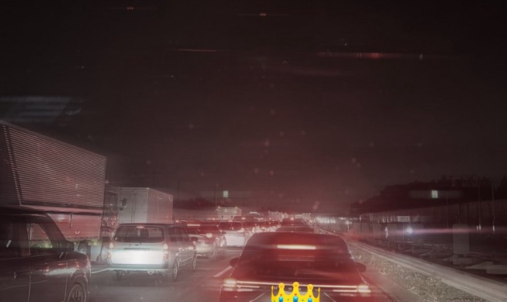 現場では赤色灯が点滅し、事故車両の撤去作業が続いており、夜間の視界が悪い中での渋滞が発生。ドライバーは急なブレーキや車線変更を避け、二次事故防止に十分な注意が必要です。