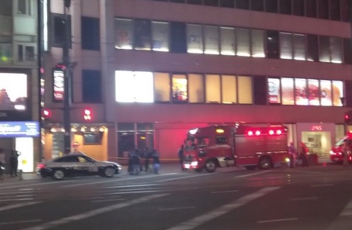 通町筋駅の交差点角にあるビル前で、消防車と救急隊が出動している様子が確認できます。